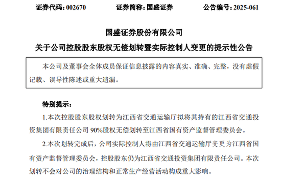 值得一提的是,当日晚,国盛证券(002670)同步公告,收到控股股东江西省交通投资集团有限责任公司(简称“江西交投”)的《告知函》,经江西省人民政府同意,江西省交通运输厅拟将其持有的江西交投90%股权由无偿划转至江西国控调整为直接无偿划转至江西省国资委。本次划转完成后,公司实际控制人将由江西省交通运输厅变更为江西省国资委,控股股东仍为江西交投。此次股权无偿划转符合相关法律法规规定,不会对公司治理及生产经营产生重大影响。